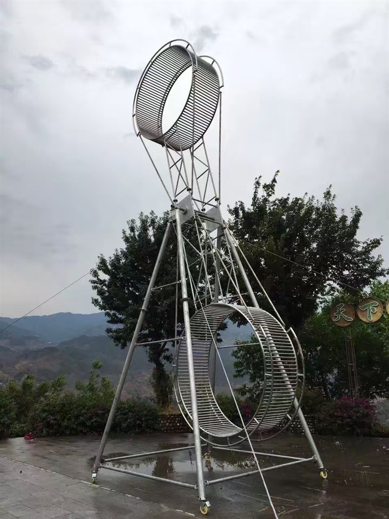《杂技-大飞轮》道具,双轮,三轮,二遍变三,四个轮,都可定制制作,制作材料,可选择:钢材:例如:矩管钢材,不锈钢钢材等...材料制作。