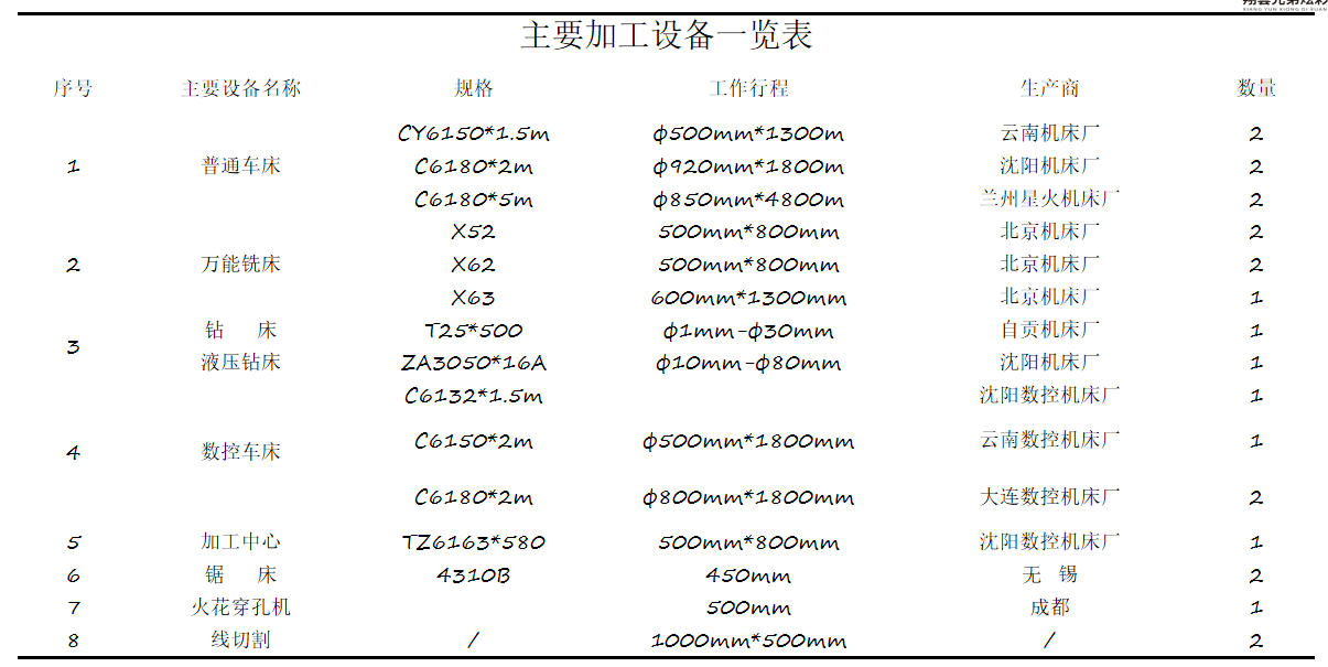主要加工设备一览表